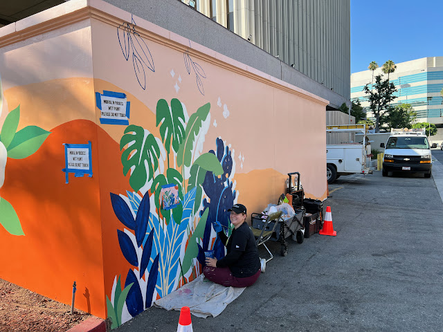 The east wall of the parking lot for the Box Springs Mountain Reserve (next to 299 East Blaine Street, Riverside) sports a colorful new mural exhibiting flowers, plants and baskets. A few of the images are signed with initials or short names but overall, it is not clear who the individual artists were. The lead artist on the project was Serena Wilson, and there is a short article in the Press Enterprise about her work. The mural is quite large so I took a video so that the entire mural can be seen. It can be seen here on YouTube.