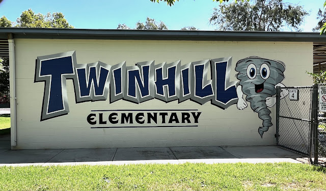 Twinhill Elementary School (11000 Campbell Ave, Riverside, CA) has a mural facing its administration building that shows the school name and a cheerful tornado, the school's mascot. The artist is unidentified.