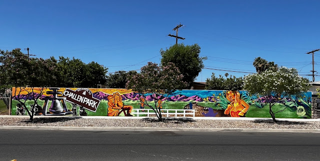 A bright new mural has been painted along a wall at 5012 Challen Avenue as a tribute to the Challen Park area. The mural shows dogs, cats, a raincross (Riverside's symbol), a couple on a bike, kids playing, and a woman walking. The mural was painted by Ronald Del Cid @rondeezyyyy of Inspired Custom Arts @inspiredcustomarts with the help of Krystal, a teacher in training, and several students from a nearby charter school. Some photos of the team painting the mural can be found below.