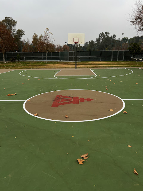 The outdoor basketball courts at Andulka Park (5201 Chicago Ave, Riverside, CA) have recently been resurfaced and a raincross, Riverside's symbol, has been painted in the center of each court. Unfortunately they were defaced soon after completion.